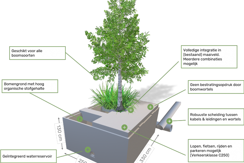De NursiTree-boombunker heeft standaard afmetingen van 2,50 bij 3,30 meter en een hoogte van 1,30 meter, wat naadloos past bij de gebruikelijke maatvoering van parkeervakken. Een lege NursiTree-bunker weegt om en nabij 8000 kilo. Gevuld met substraat en een uitgegroeide boom zou het totale gewicht rond de 16 ton zijn. Een NursiTree-bunker biedt plaats aan zeven kuub substraat. Dat is voldoende om een boom (afhankelijk van het sortiment) vijftien tot twintig jaar te laten groeien. Na die periode haal je de boom uit de bak, plant je hem op een andere plaats in de gemeente en krijgt de bunker een kersverse nieuwe boom.