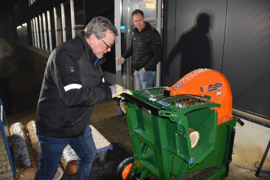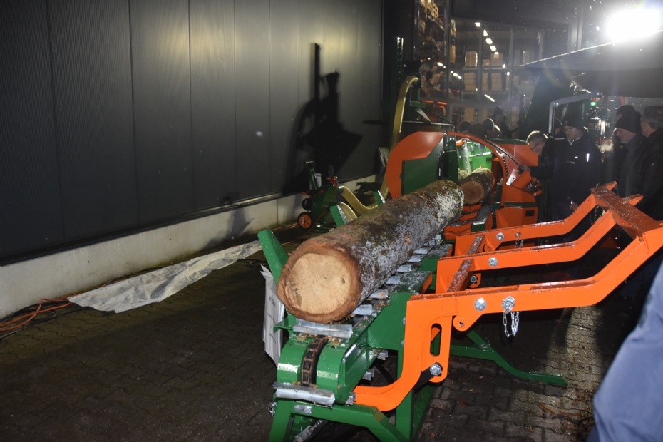 Op de avondlijke Posch-demobijeenkomst bij Stierman De Leeuw kwamen zo'n 60 Nederlandse 'houtboeren' zaag-kloofmachines bekijken en uitproberen. De absolute publiektrekker was een complete 380V-houtkloofprocessor. De nieuwe stationaire SpaltFix S-376 kan stammen met een diameter tot 37 cm zagen, vervolgens kloven en optioneel verpakken, bijvoorbeeld in ronde bigbags van 1,5 m3. Aan de aanvoerband had Posch een laadplateau bevestigd. Dit plateau brengt de stammen op hoogte, waarna ze richting de beschermde 90cm-cirkelzaagunit getrokken worden. De operator kan de lengte van de te kloven blokken instellen van 20 tot 50 cm. Hierbij kunnen de stammen iets worden doorgeschoven in de invoer, om bij het doorzagen geen incourante houtblokken over te houden. Vervolgens doet de hydraulische kloofunit zijn werk. Dit alles was te zien door een beschermend venster.