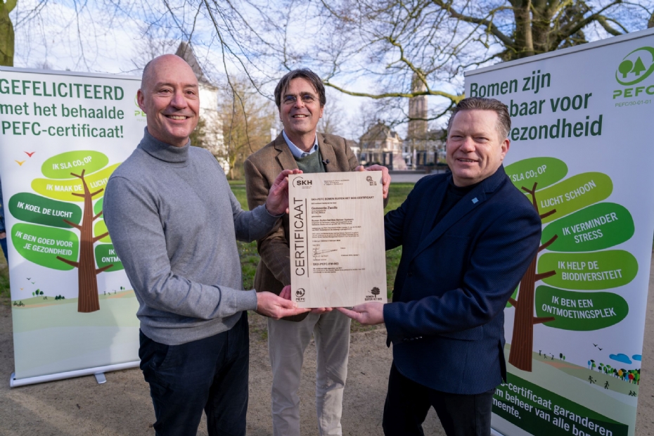 Zwolle heeft een primeur te pakken. Als eerste stad ter wereld heeft de gemeente het PEFC-certificaat voor Bomen Buiten het Bos behaald. Dit certificaat toont aan dat het beheer van bomen buiten traditionele bossen, zoals laanbomen, parkbomen en bomen in natuurstroken, op een duurzame en verantwoorde manier gebeurt - een zeer belangrijke stap in stedelijk groenbeheer. De officiële uitreiking vond plaats in Park Eekhout, waar Oscar van Doorn, directeur van SKH (Stichting Keuringsbureau Hout), het in hout gegraveerde certificaat overhandigde aan wethouder Arjan Spaans.