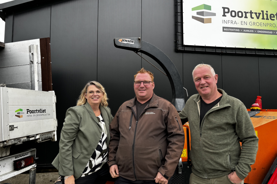 Waar de werkzaamheden van Poortvliet Infra- en Groenprojecten oorspronkelijk bij hovenierswerk en groenvoorziening ligt, is hun blik sinds een paar jaar ook omhoog gericht in de vorm van twee medewerkers die European Tree Workers zijn. Bij binnenkomst in de kantine word je eerst enthousiast begroet door hond Guus, daarna door eigenaar Koen Poortvliet, administratief medewerkster Ester Poortvliet en een van hun zonen Kees Poortvliet. Het familiebedrijf investeert stevig in kwaliteit en veiligheid, waar certificeringen als Groenkeur en VCA geen vinkjes op papier zijn, maar een bewuste keuze om professioneel en veilig te werken.