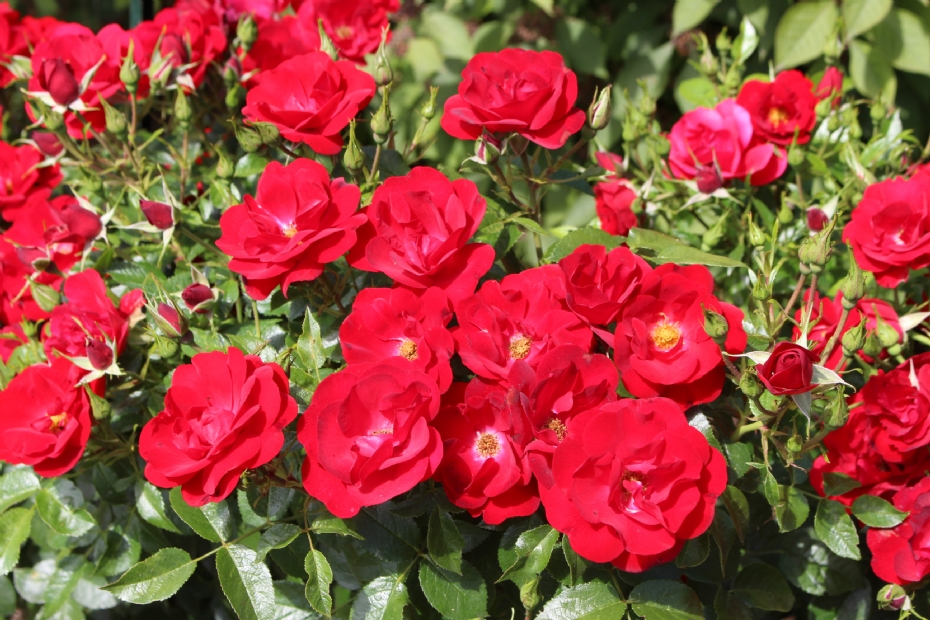Heesterroos van Kordes met halfgevulde, diep fluwelig rode bloemen. De gele meeldraden steken mooi af tegen de donkere bloemkleur. De bloemen geuren licht en schonen goed. Bereikt een hoogte van 80 tot 140 cm.