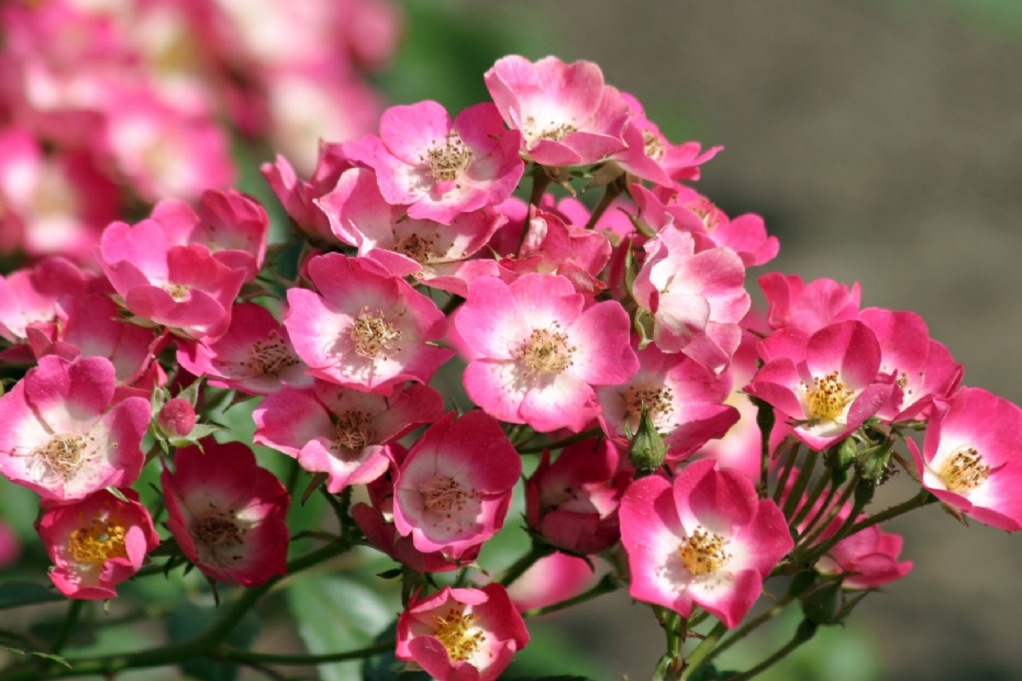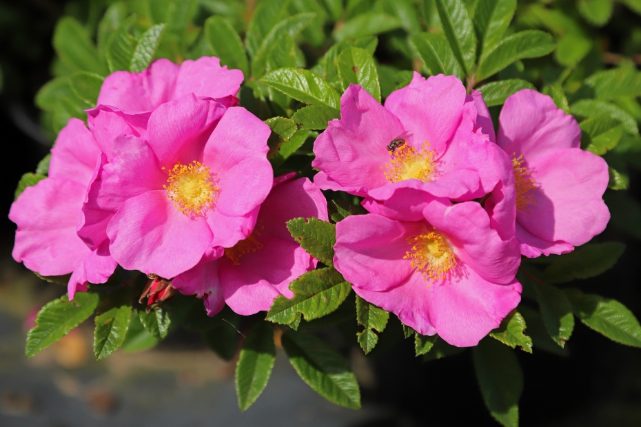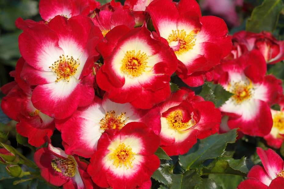 Loki ('Tan16512'): Bossig groeiende floribundaroos van Rosen Tantau. De felroze, enkelvoudige bloemen hebben een wit hart en opvallende, donkergele meeldraden. Ze geuren licht en schonen goed. In het najaar verschijnen ronde bottels die van groen naar oranje verkleuren. Hoogte tussen de 50 en 100 cm.