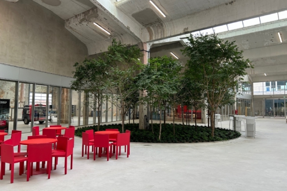 De plantensoorten die buiten zijn toegepast kunnen niet goed groeien in een binnenklimaat. Daarom is er binnen gekozen voor tropische bomen in verschillende vormen met een losse groeiwijze waardoor ook daar het beeld van een bosje ontstaat. Bij dit project zijn de Belgische tuinarchitecten Bart Haverkamp en Pieter Croes betrokken. Hun vernieuwende en vooruitstrevende manier van denken past bij de gedeelde visie van Schipper Bosch, Space Encounters en ZUS.office. Dit project vormt een eerste aanzet voor de inrichting van het groen op de rest van het terrein.