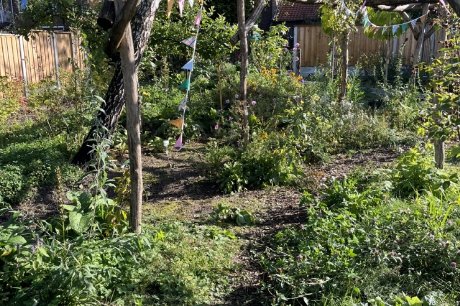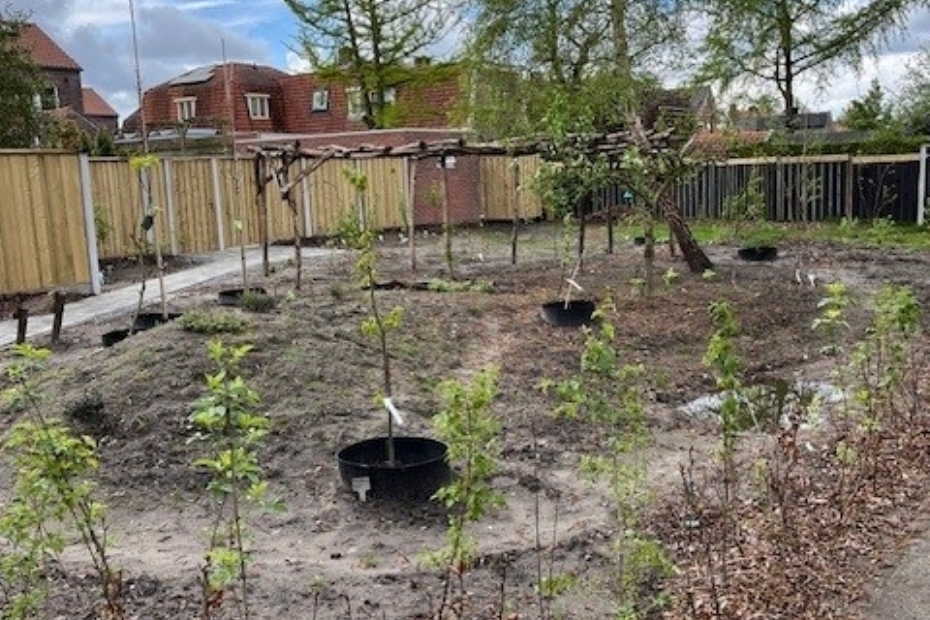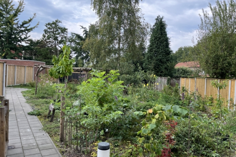 In plaats van de braakliggende grond heeft de corporatie de ruimte netjes plantklaar gemaakt. Vervolgens hebben buurtbewoners samen het initiatief genomen om de nieuwe gemeenschappelijke grond in te richten als een voedselbosje. Er is ook gekozen voor inheemse planten die zorgen voor meer biodiversiteit. Daarnaast is er een kleine wadi aangelegd en er wordt regenwater opgevangen, waardoor de grond beter bestand is tegen droogte en piekbuien. Het resultaat is een groene ontmoetingsplek waar buren elkaar regelmatig treffen. Huurders én kopers, mensen die voorheen vaak nauwelijks contact hadden. Wat ooit ongebruikte privé tuinen waren, is nu een duurzaam stukje buurtgroen dat niet alleen de natuur maar ook de onderlinge banden versterkt.
