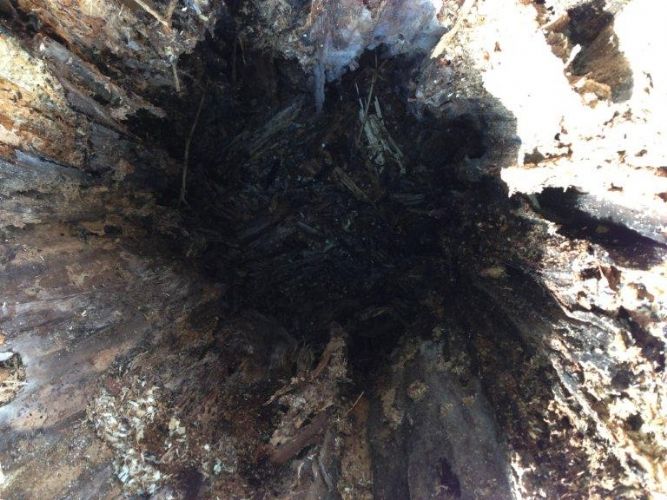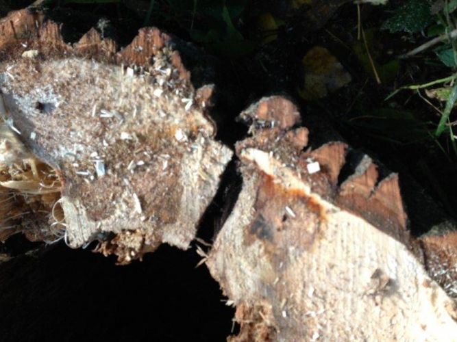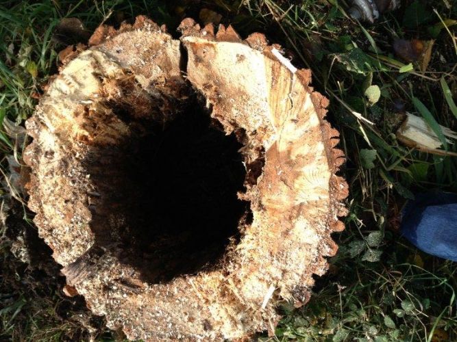 Bijgaande foto werd de redactie van Boomzorg toegestuurd door Vincent Klok van Klok Projecten Bomen & Biomassa uit Druten. Het bedrijf van Klok werd door de groenbeheerder van de gemeente gevraagd een populier om te zagen. De boom bleek in ernstige mate verrot. Opmerkelijk was dat het kernhout tot op een diepte 1,20 meter onder het maaiveld was weggerot.