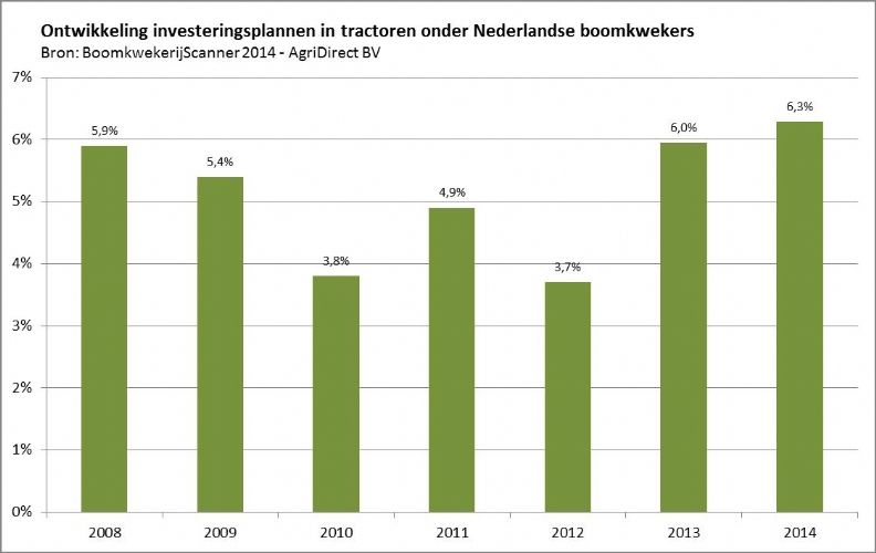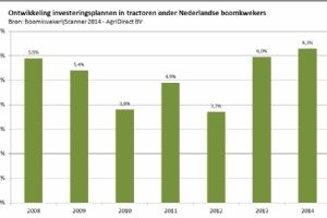 Van de boomkwekers heeft 6,3% plannen om binnenkort een tractor te gaan aanschaffen. Vorig jaar lag dit percentage op 6,0%. Hiermee wordt onder de Nederlandse boomkwekers het hoogste investeringspercentage in een tractor bereikt sinds 2008.